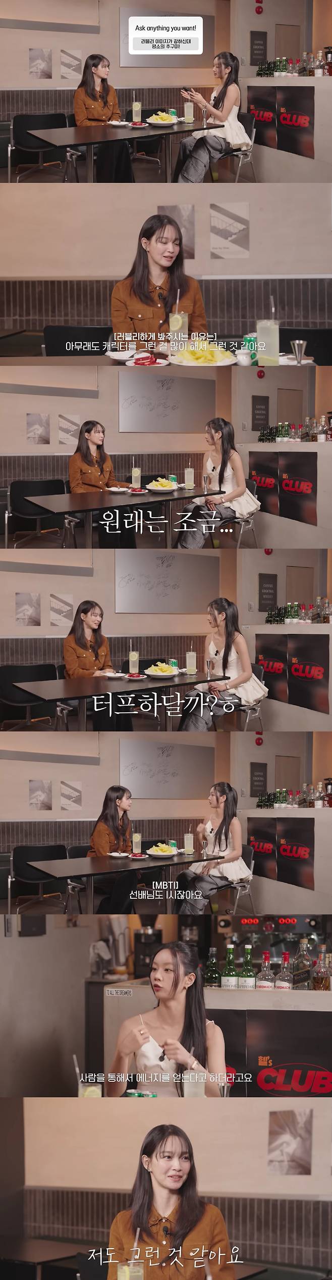 이에 혜리는 "E(외향적)성향의 특징이 사람을 통해 에너지를 얻는다고 한다"라고 설명했고, 신민아는 "저도 그런 것 같다. 좋아하는 사람과 같이 있으면 (에너지를 얻는다)"라고 공감했다.