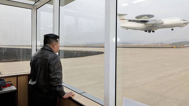 북한이 공개한 사진에는 비행기 상단에 레이더돔을 장착해 북한판 공중조기경보통제기로 보이는 듯한 비행기를 김정은이 참관하는 모습이 담겼습니다.