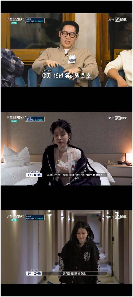 유혜원은 “저는 기권입니다. 안녕히 계세요”라며 깔끔하게 인사하고 물러났다. 유헤원은 “저는 포커페이스가 안 되니까, 괜히 눈 안 마주치고, 3번 황재근이 저를 픽할 줄 알았는데, 안 했다”라면서 “그렇다고 서진주에게 황재근을 빼앗아 올 수 없었다. ‘널 내게 오게 만들겠어’ 이게 절대로 되는 스타일이 아니다. 저는 누군가가 열 번 찍으면 못내 끌려가는 스타일이다”라고 말했다.