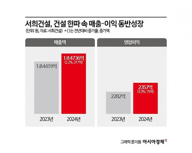 27일 금융감독원에 따르면 서희건설은 지난해 매출 1조4736억원, 영업이익 2357억원을 기록했다. 전년 대비 각각 2.2%(317억원), 3.3%(75억원) 증가한 금액이다.