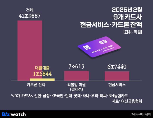 26일 여신금융협회에 따르면 지난달 말 국내 9개 카드사(신한·삼성·KB국민·현대·롯데·하나·우리·비씨·NH농협카드)의 카드론 잔액은 42조9888억원으로 집계됐다. 이는 역대 최대였던 1월 말 잔액(42조7309억원)보다 2579억원 늘어난 규모다.