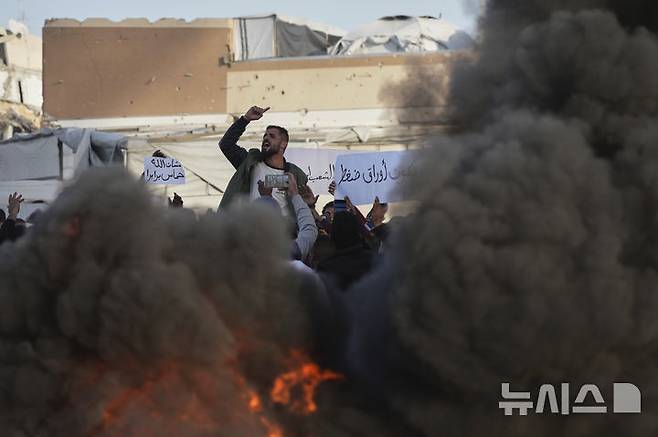 [베이트 라히아=AP/뉴시스] 26일(현지 시간) 가자지구 북부 베이트 라히아에서 팔레스타인 주민들이 반(反)하마스 시위를 열고 구호를 외치고 있다. 시위 참가자들은 "하마스를 쫓아내자" "하마스는 테러리스트" "전쟁을 끝내라" 등의 구호를 외쳤다. 하마스가 통치하는 이 지역에서 이 같은 공개적 분노가 표출되는 것은 드문 일이다. 2025.03.27.
