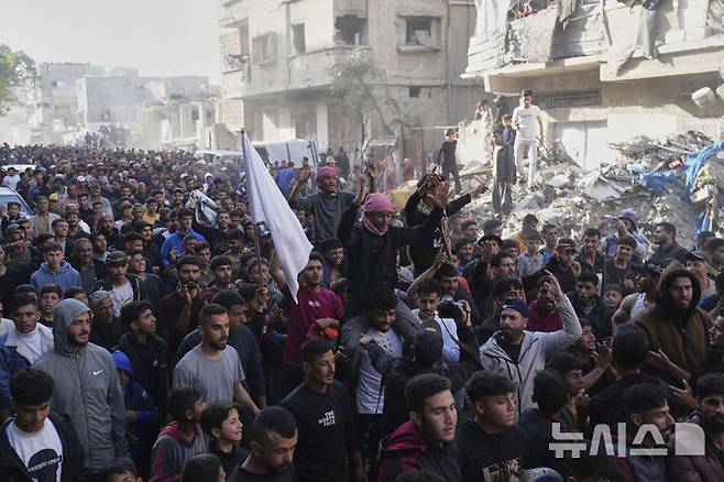 [베이트 라히아=AP/뉴시스] 26일(현지 시간) 가자지구 북부 베이트 라히아에서 팔레스타인 주민들이 반(反)하마스 시위를 열고 구호를 외치고 있다. 시위 참가자들은 "하마스를 쫓아내자" "하마스는 테러리스트" "전쟁을 끝내라" 등의 구호를 외쳤다. 하마스가 통치하는 이 지역에서 이 같은 공개적 분노가 표출되는 것은 드문 일이다. 2025.03.27.