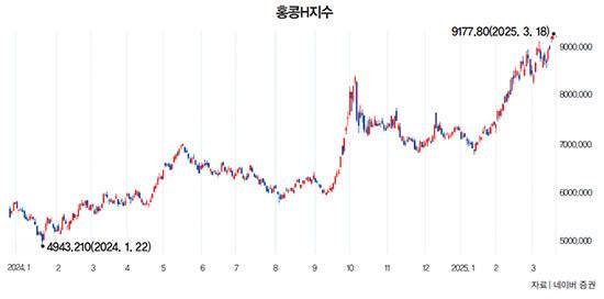 홍콩H지수 반등은 지난해 9월 시동을 걸었다. 국가 경제에서 비중이 큰 부동산시장이 붕괴 조짐을 보이자 중국 정부가 경기부양책을 잇달아 발표하며 급한 불을 껐기 때문이다. 올해 양회에서도 중국 정부는 '5% 경제성장'을 목표로 재정정책을 적극 펴겠다고 선언했다. 여기에 중국 인공지능(AI) 스타트업 딥시크가 저비용-고성능 추론 AI 모델을 공개해 힘을 보탰다. 빠르게 성장하는 AI가 중국 신성장동력으로 부각되면서 투자심리 개선을 이끈 것이다. 지난해 9월 8000 선을 탈환한 홍콩H지수는 이후 소폭 하락한 뒤 올해 2월부터 지속적으로 상승하고 있다.