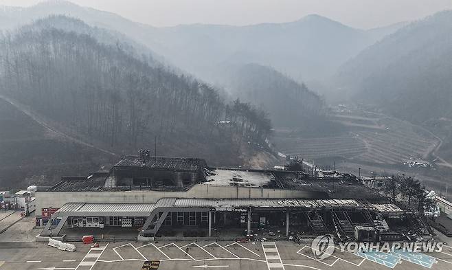(청송=연합뉴스) 윤관식 기자 = 27일 경북 청송군 서산영덕고속도로 청송휴게소(영덕방향)가 산불에 폐허가 돼 있다. 2025.3.27