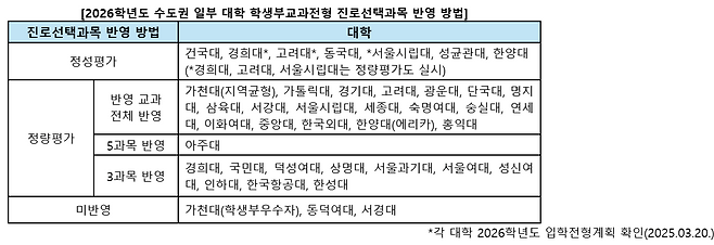 올해 일부 대학에선 진로선택과목의 반영과목 수를 변경했다. 단국대와 숙명여대는 전년도까지 진로선택과목 중 3과목만 반영했으나 2026학년도에는 반영 교과에 해당하는 전 과목을 반영한다. 아주대는 기존 3과목에서 5과목으로 반영과목 수를 늘렸다. 반면 서울과기대는 지난해 진로선택과목에서 반영 교과 전 과목을 반영했으나 올해는 3과목만 반영한다.