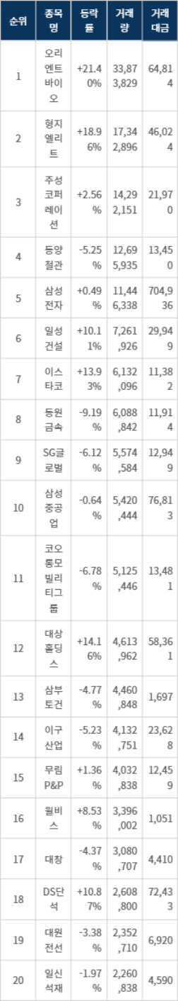 한편 거래량 상위 20위권 종목들은 코오롱모빌리티그룹(450140) ▼6.78%, 대상홀딩스(084690) ▲14.16%, 삼부토건(001470) ▼4.77%, 이구산업(025820) ▼5.23%, 무림P&P(009580) ▲1.36%, 윌비스(008600) ▲8.53%, 대창(012800) ▼4.37%, DS단석(017860) ▲10.87%, 대원전선(006340) ▼3.38%, 일신석재(007110) ▼1.97% 등의 성적을 기록했다.