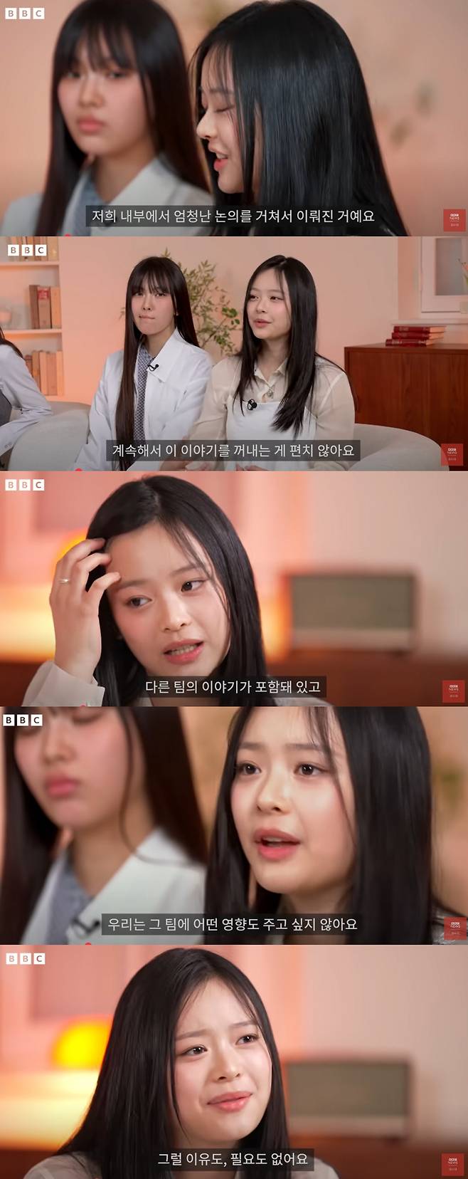 뉴진스는 26일 영국 BBC 뉴스 코리아에서 "지난 1년 동안 우리가 내린 결정과 선택은 다섯 명이 모두 동의한 것이다. 만약 한명이라도 원치 않는다면 우리는 하지 않을 거라고 말한다. 2024년 이 상황을 겪으며 모든 걸 조용히 감추려 했지만 폭발할 것 같은 지경까지 왔다"고 법적 분쟁을 선택한 이유를 밝혔다.