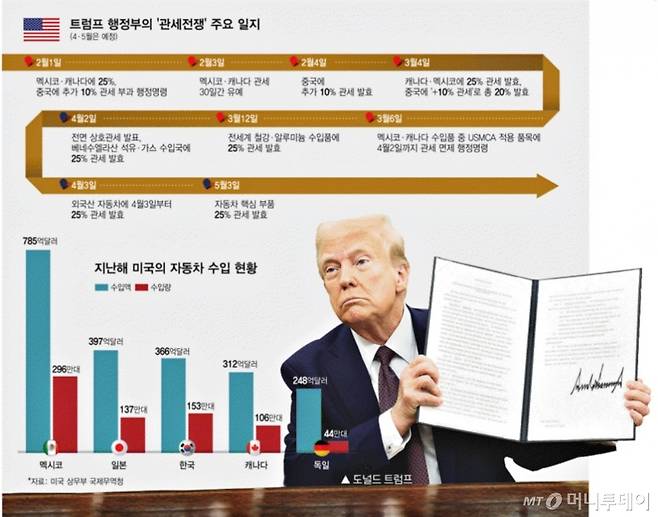 특히 미국 자동차 시장 구조를 볼 때 사실상 한국을 비롯해 일본과 독일 등의 완성차업체와 이들 업체가 그동안 관세 영향을 줄이기 위해 생산공장을 운영해온 멕시코·캐나다를 겨냥한 조치라는 해석이 나올 수밖에 없는 상황이다. 재집권 초반부터 동맹·우방국을 가리지 않고 몰아치는 관세전쟁 확전 방침을 재확인할 수 있는 조치인 셈이다.