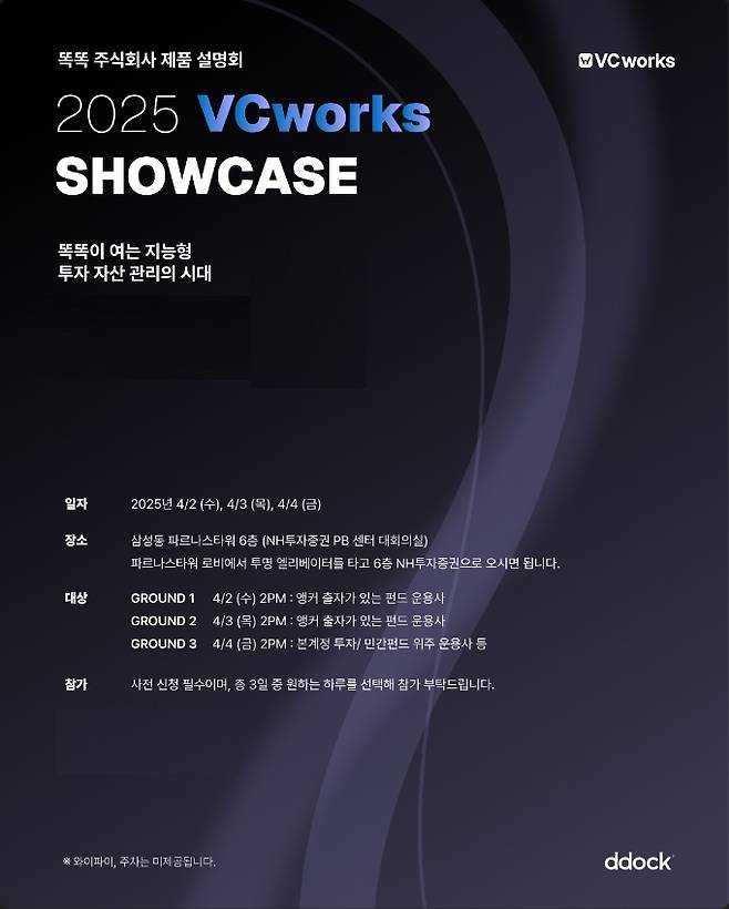 쇼케이스는 2일부터 4일까지 매일 오후 2시에 파르나스타워 6층 PB센터 대회의실에서 진행된다. 2일과 3일은 앵커 출자가 있는 펀드 운용사를 대상으로, 4일에는 본계정 투자 혹은 민간펀드 위주 운용사 등을 대상으로 진행한다. 3개 일자 중 원하는 1개 일자에만 참여할 수 있다.