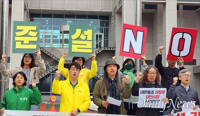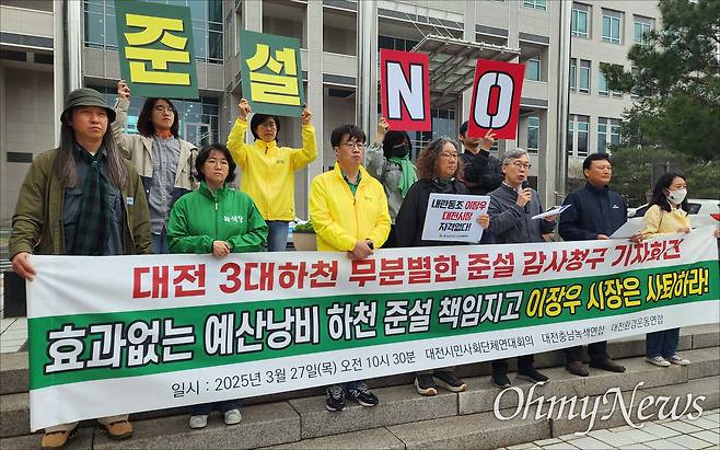 이날 기자회견 참석자들은 "근거 없는 3대 하천 준설 책임지고 이장우 시장은 사퇴하라", "대전시는 예산낭비 생태계 학살 3대 하천 준설 중단하라"는 등의 구호를 외쳤다.