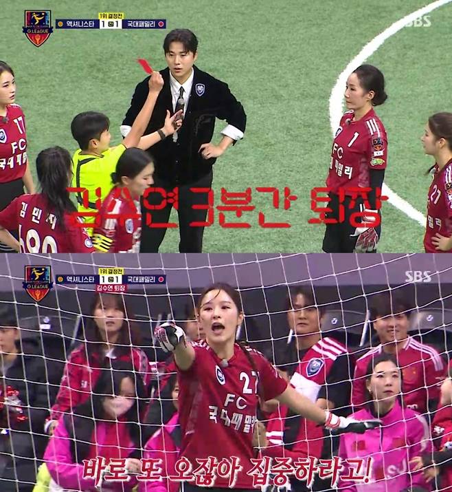이후 ‘국대패밀리’에는 최대 위기가 찾아왔다. 골키퍼 김수연이 페널티 박스 밖에서 공을 손으로 잡는 반칙을 범해 3분간 퇴장당하는 사태가 발생한 것이다. 이에 따라 ‘국대패밀리’는 한 명이 부족한 상태에서 경기를 이어가야 했다. 급히 대체 골키퍼로 나선 인물은 다름 아닌 핸드볼 선수 출신 박하얀이었다. 박하얀은 “공에 대한 두려움은 없다”라며 당당한 모습을 보였고, 실제로 장갑을 끼자마자 침착한 판단력과 순발력으로 상대의 공격을 막아냈다. 수적 우위를 점한 ‘액셔니스타’는 이 기회를 살려 추가 득점을 노렸지만, 박하얀의 선방과 ‘국대패밀리’의 조직적인 수비에 가로막히며 전반전은 1대 1로 마무리됐다.