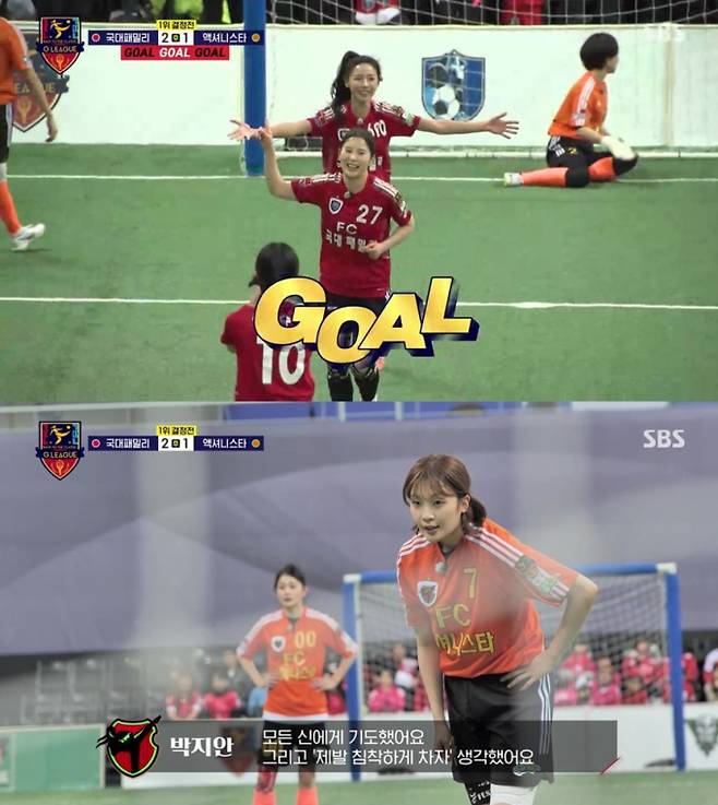 경기의 첫 골은 뜻밖의 주인공에게서 나왔다. 전반 초반 ‘액셔니스타’의 박하나가 흘러나온 공을 정확하게 밀어 넣으며 560일 만에 득점을 기록한 것이다. 오랜 시간 골 가뭄에 시달렸던 박하나는 골이 터지자 감격스러운 표정을 감추지 못했다. 그는 “정말 오랜만에 넣은 골이라 감정이 벅차올랐다. 연기를 하면서도 이렇게 울컥한 적은 몇 번 없었다”라며 감격스러운 소감을 밝혔다.