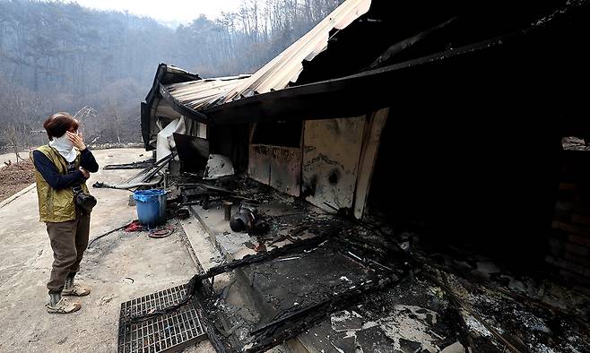 마음도 숯덩이 27일 경북 영양군 석보면 화매리에서 발생한 산불로 삶의 터전을 잃은 한 주민이 전소된 집을 바라보며 안타까워하고 있다. 영양=뉴시스