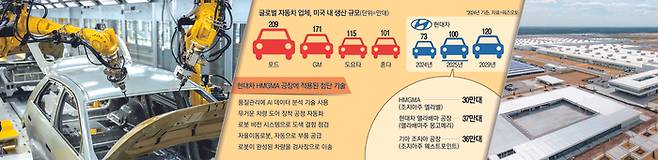 26일(현지시간) 현대차그룹은 최대 연 30만대의 자동차를 생산할 수 있는 HMGMA를 준공했다. 현대차그룹은 현재 월 2000~3000대를 생산하는 HMGMA 생산량을 꾸준히 끌어올려 3년 후인 2028년에는 연 30만대를 생산할 계획이다. 기존 현대차 앨라배마 공장(연 37만대)과 기아 조지아 공장(연 36만대)를 합하면 미국 생산 100만대 체제를 구축하게 된 셈이다. 2024년 기준 미국에서 차량 연 100만대 이상을 생산하는 자동차 기업은 미국 회사인 포드와 GM, 그리고 일본 회사인 도요타와 혼다까지 4곳뿐이다.