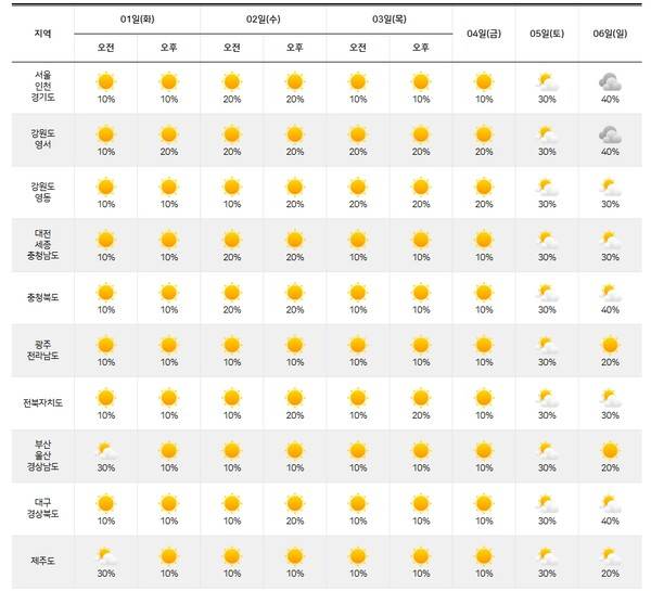 전국 주요 도시별 예상 최저기온은 △서울 3도 △인천 3도 △춘천 3도 △강릉 6도 △대전 5도 △대구 8도 △전주 5도 △광주 5도 △부산 10도 △제주 7도다.