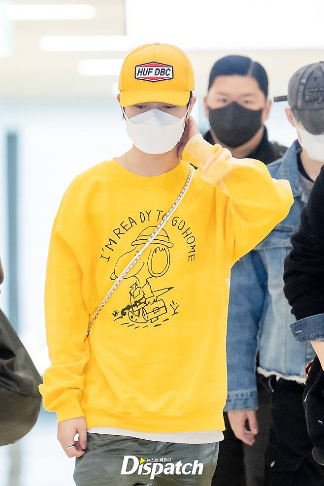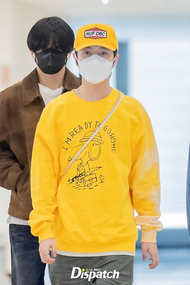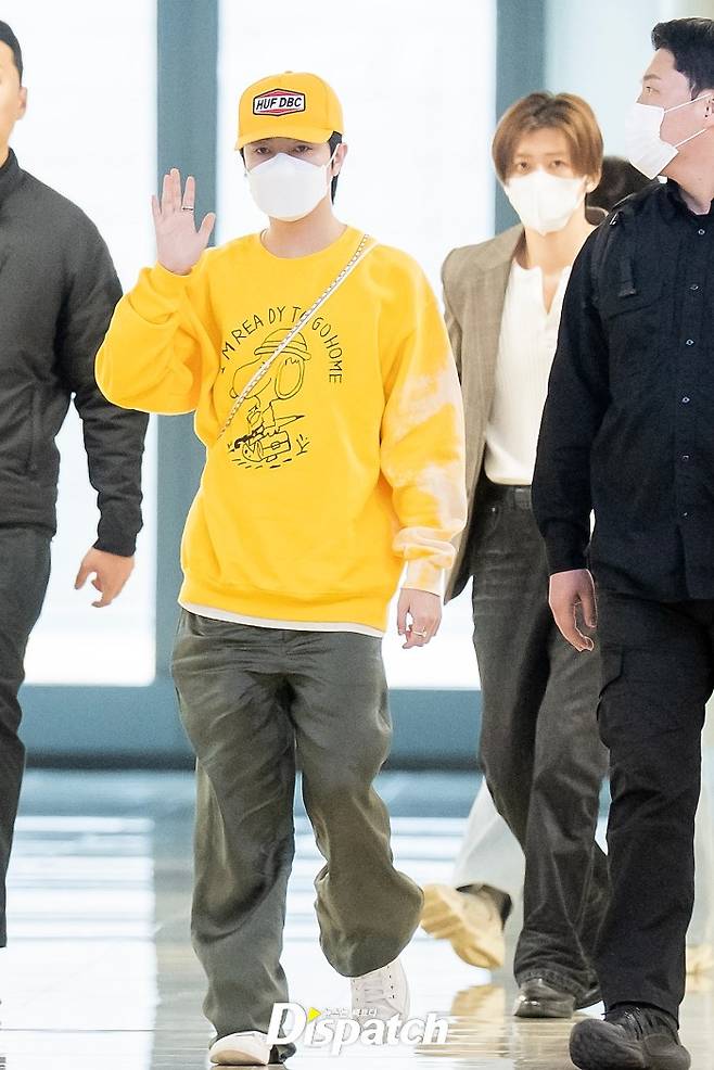 런쥔은 옐로우 스웻셔츠와 모자로 멋을 냈다. 화사한 분위기가 돋보였다.