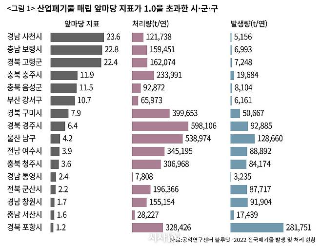 이제 수치를 보자. 우선 산업폐기물(사업장 폐기물+지정폐기물 합산) ‘매립’ 항목이다(〈그림 1〉 참조). 전국에서 가장 앞마당 지표가 높은 지자체는 경남 사천시였다. 2022년 지역에서 산업폐기물 5156t이 발생했는데, 처리량은 12만1738t이었다. 사천시의 앞마당 지표는 23.6이다. 발생량보다 23.6배 많은 산업폐기물을 매립했다는 뜻이다. 그 뒤로 충남 보령시(22.8), 경북 고령군(22.4), 충북 충주시(11.9), 충북 음성군(11.5), 부산 강서구(10.7) 순이었다. 경북 구미시(7.9), 경북 경주시(6.4), 울산 남구(4.2), 전남 여수시(3.9), 충북 청주시(3.6)도 높은 수치를 나타냈다.