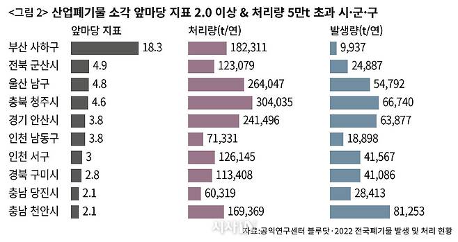 이번에는 〈그림 2〉를 보자. 산업폐기물 ‘소각’ 앞마당 지표 순위다. 소각의 경우 지표가 1을 넘긴 곳이 많아 지표 2 이상, 처리량 연간 5만t 넘는 곳만 10곳을 추렸다. 부산광역시 사하구가 18.3으로 1위였다. 이어서 전북 군산(4.9), 울산 남구(4.8), 충북 청주(4.6), 경기 안산(3.8)이었다. 부산 사하구에는 1986년 조성된 신평장림 산업단지가 있기는 하지만, 발생량(9937t)에 비해 처리량(18만2311t)이 매우 많았다. 신평장림 산업단지 주변에 설치된 폐기물 소각장 두 곳(사하구 신평동, 구평동)에 외부 폐기물이 반입된 걸로 추정된다. 소각 처리량으로만 보면 충북 청주시가 약 30만t으로 가장 많다. 울산 남구가 약 26만t, 경기도 안산시가 24만t으로 뒤를 이었다.