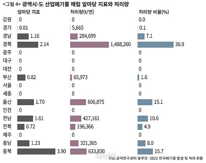 최근 여기서 한발 더 나아간 새로운 지표가 발표됐다. 지난 2월 공익연구센터 블루닷이 발표한 ‘산업폐기물 앞마당 지표’가 그것이다. 이 지표는 환경부에서 발표한 ‘2022년 전국 폐기물 발생 및 처리현황’을 분석해 각 지자체(시·군·구)의 폐기물 발생량과 지자체 소재 폐기물 시설의 처리량을 비교한 수치다. 수치가 높을수록 폐기물 처리 부담을 많이 지는 지역이라는 뜻이다. 예컨대 2022년 A 시의 산업폐기물 발생량이 100t이고, A 시 소재 산업폐기물 매립장의 처리량이 350t이라면 A 시의 ‘산업폐기물 매립 앞마당 지표’는 3.5(350t/100t)다. 즉 A 시는 발생량보다 약 3.5배 많은 산업폐기물을 처리하고 있다고 볼 수 있다. 그만큼 타 지역 폐기물이 많이 반입되고 있다는 방증이다. 블루닷은 이 지표가 “산업폐기물 처리 부담의 지역 간 불평등을 보여준다”라고 설명했다. 다만 산업폐기물 발생량과 처리량은 서로 데이터 취합 기준(전년도 이월분 처리 등) 시점 등이 달라 20% 정도 편차를 보일 수 있다고 블루닷은 설명했다.