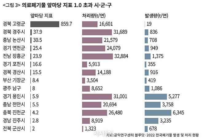 전국 14곳에 있는 의료폐기물 처리장은 모두 소각장이다. 그런데 경북 고령군의 수치가 확 튄다. 859.7로 압도적이다. 고령의 의료폐기물 발생량이 겨우 19t인데, 처리량은 약 1만6000t에 달한다(〈그림 3〉 참조). 대도시(대구)와 가까우면서도 인구밀도는 낮은 고령은 산업 쓰레기로 몸살을 앓는 지역이다. 이미 폐기물 처리장 세 곳(사업장, 지정, 의료폐기물 한 곳씩)이 설치돼 있지만, 엎친 데 덮친 격으로 새롭게 산업폐기물 처리장 4곳이 동시 추진되면서 지역이 큰 분쟁을 겪었다.