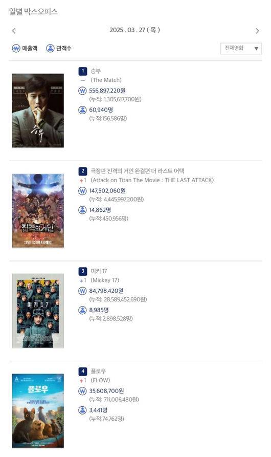 올봄 극장가 최고의 화제작 '승부'가 이틀 연속 전체 박스오피스 1위에 등극했다.