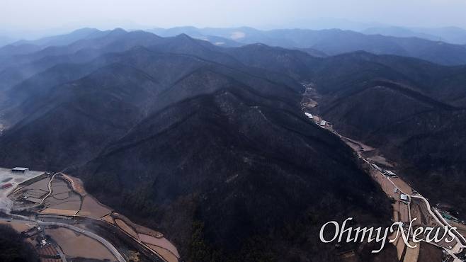 | ▲ 27일 오후 경북 안동시 임하면 일대 넓은 산이 산불로 인해 시커멓게 변해 있다. |