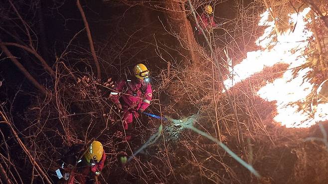 ▲ 산림청 공중진화대와 산불재난특수진화대가 26일 오후부터 27일 새벽 사이 경남 산청군 시천면 동당리 일대에서 지리산과 민가를 지키기 위해 사투를 벌이고 있다.