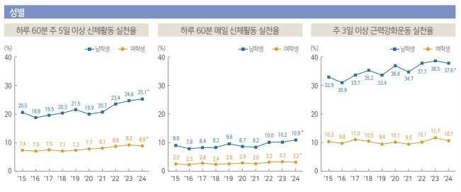 상대적으로 남성 청소년보다 여성 청소년의 신체활동에 빨간불이 켜졌음도 확인됐다. 2024년 하루 60분씩 주 5일 이상 신체활동 실천율을 조사해 본 결과 남학생의 신체활동 실천율은 25.1%인데 비해 여학생은 8.9%로 3배나 차이가 났다.