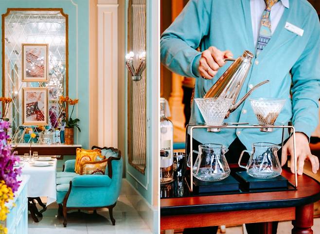 팔라조 베르사체 호텔에 위치한 만큼 레스토랑의 전체 인테리어 역시 베르사체를 기반으로 디자인됐다. 이탈리아 대리석으로 만들어진 장미꽃부터 이탈리아 장인이 직접 제작한 바닥, 베르사체 식기, 와인잔 등에 이르기까지, 시종일관 베르사체만의 고풍스러움이 계속된다.