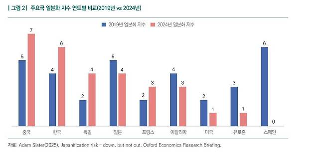 그 결과를 보면 작년 기준 한국의 일본화 지수는 6점(10점 만점)이었다. 전 세계 주요 30개국 중 태국과 중국이 각 7점으로 가장 높았고 이어 한국과 홍콩은 각 6점으로 공동 3위였다. 이들 상위 4개국에서는 높은 부채비율, 생산연령인구 증가율 하락, 주식가격 하락 등의 현상이 공통적으로 나타났다.