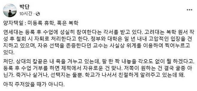 박 위원장은 오늘(28일) 자신의 SNS에 '양자택일 미등록 휴학, 혹은 복학'이라는 게시글을 올려 이같이 말하며 "아직 주저앉을 때가 아니다"고 밝혔습니다.