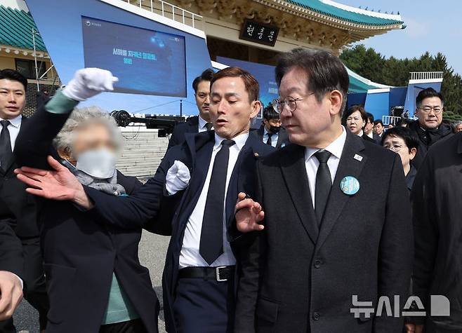 [대전=뉴시스] 최진석 기자 = 이재명 더불어민주당 대표가 28일 국립대전현충원에서 열린 제10회 서해수호의 날 기념식에서 퇴장하던 중 한 유가족에게 항의를 받고 있다. (대통령실통신사진기자단) 2025.03.28. myjs@newsis.com
