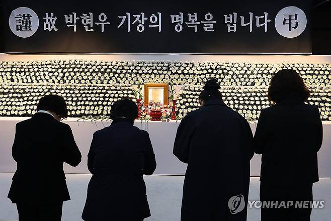 (의성=연합뉴스) 김도훈 기자 = 28일 경북 의성군청소년문화의집에 마련된 고 박현우 기장의 분향소를 찾은 시민들이 헌화 뒤 묵념하고 있다.