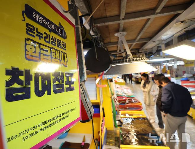 [인천=뉴시스] 전진환 기자 = 인천시가 수산인의 날(4월 1일)을 맞아 국산 수산물 소비 촉진을 위해 28일부터 4월 1일까지 인천 전통시장 5곳에서 국내산 수산물을 사면 최대 2만원을 돌려주는 온누리상품권 환급행사를 진행한다. 사진은 28일 인천 남동구 소래포구전통어시장에서 점포에 '온누리상품권 환급행사 참여점포'를 알리는 안내문이 붙어 있다. 2025.03.28. amin2@newsis.com