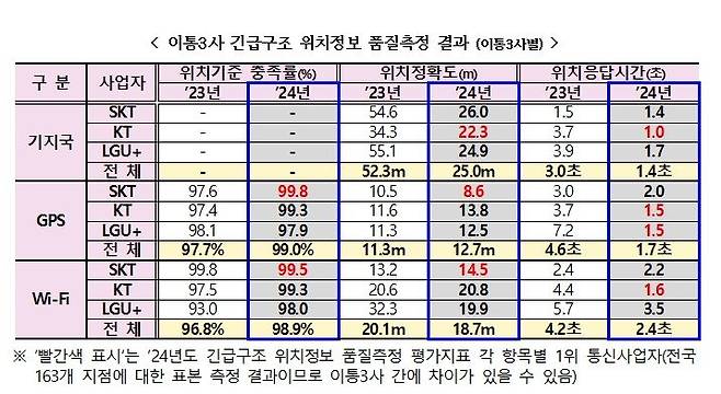 다만 위성항법 시스템(GPS) 방식은 2023년 대비 위치기준 충족률이 97.7%에서 99.0%, 위치응답시간이 4.6초에서 1.7초로 향상됐지만 위치정확도는 11.3m에서 12.7m로 다소 낮아졌다.