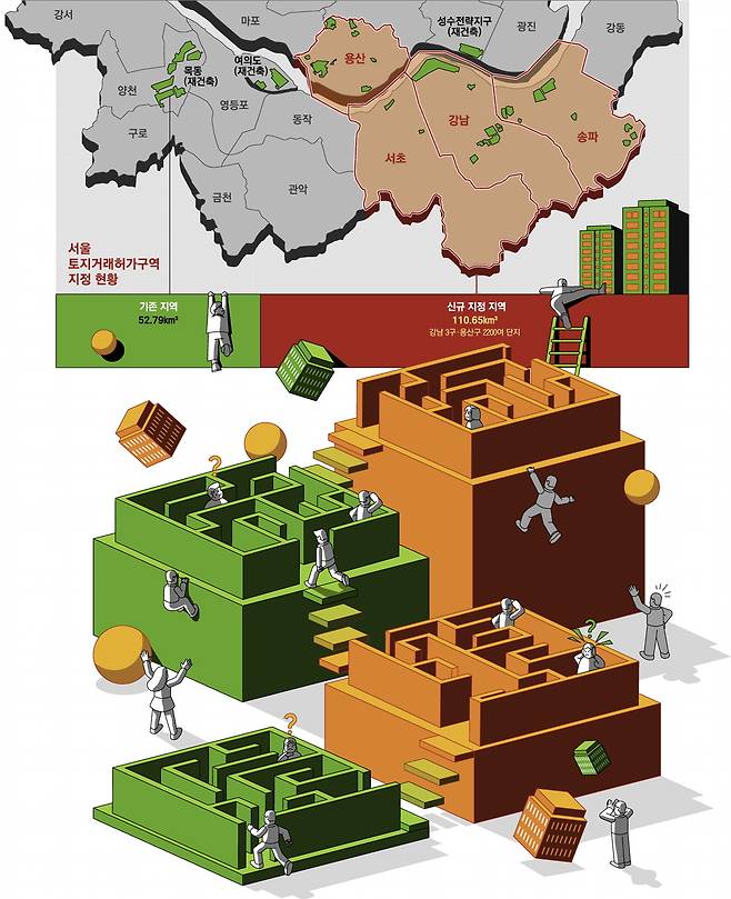 서울 강남 3구(강남·서초·송파구)와 용산구 전체 아파트가 계약일 기준으로 지난 24일부터 토지거래허가구역으로 묶였다. 오는 9월 30일까지가 기한이지만 정부는 시장 상황을 봐서 연장할 수 있다는 단서를 달았다.