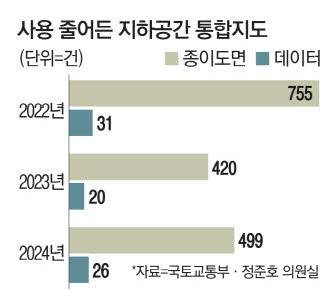 건설업체는 건기연을 통해 지도를 종이도면이나 데이터 형태로 청구한 뒤 받을 수 있다. 땅속 10m 이상 깊이로 공사하는 현장에선 의무적으로 이 지도를 사용해 상하수도와 전기·가스선, 통신선, 지하철과 지하차도, 지하상가와 지하주차장 등을 파악해야 한다. 하지만 정준호 민주당 의원실이 국토부에서 제출받은 자료에 따르면 이 지도의 종이도면 제공 건수는 2022년 755건에서 지난해 499건으로 뚝 떨어졌다. 데이터 제공 건수는 이보다 훨씬 적어 같은 기간 역시 31건에서 26건으로 감소했다. 한 대형 건설사 관계자는 "종이도면과 데이터 모두 반출 요청을 해도 보안 문제상 10일 이상 걸릴 정도로 절차가 까다로운 데다 종이도면을 받으러 일일이 직접 찾아가야 해 불편한 점이 많다"고 말했다.