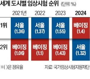 28일 국가임상시험지원재단에 따르면 2024년 글로벌 제약사 주도 의약품 임상시험에서 서울 지역 의료기관 점유율은 1.32%로 베이징(1.4%)에 이어 2위를 기록했다. 서울이 최고 순위를 내준 것은 7년 만이다. 과거 세계 최고 암센터 MD앤더슨이 있는 미국 휴스턴과 1·2위를 엎치락뒤치락하던 서울은 2017년부터 2023년까지 계속 1위를 유지했다. 베이징은 2021년 이후 줄곧 서울에 밀려 2위를 기록하다가 지난해 처음으로 1위에 올랐다. 지난해 임상시험 점유율 3위 도시는 중국 상하이(1.07%), 4위는 미국 휴스턴(0.98%) 이다.