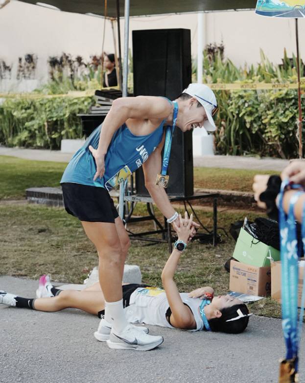 모든 걸 다 쏟아낸 듯 결승선에 들어와 길바닥에 누워버린 하음이가 탈진해 있다. 이를 본 션은 딸 하음이의 손을 잡으며 축하하고 격려하고 있는 모습이다.