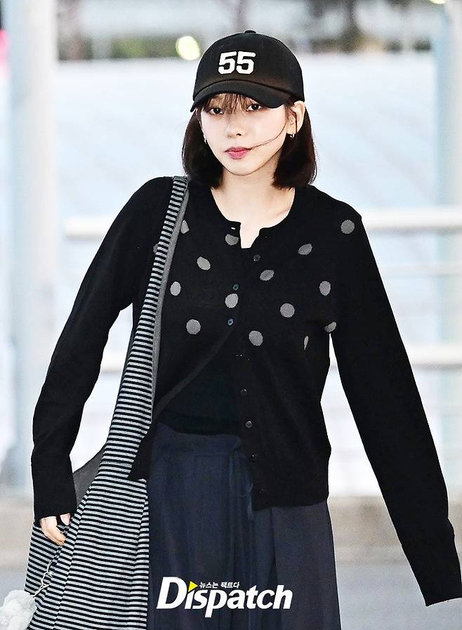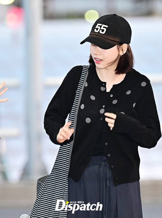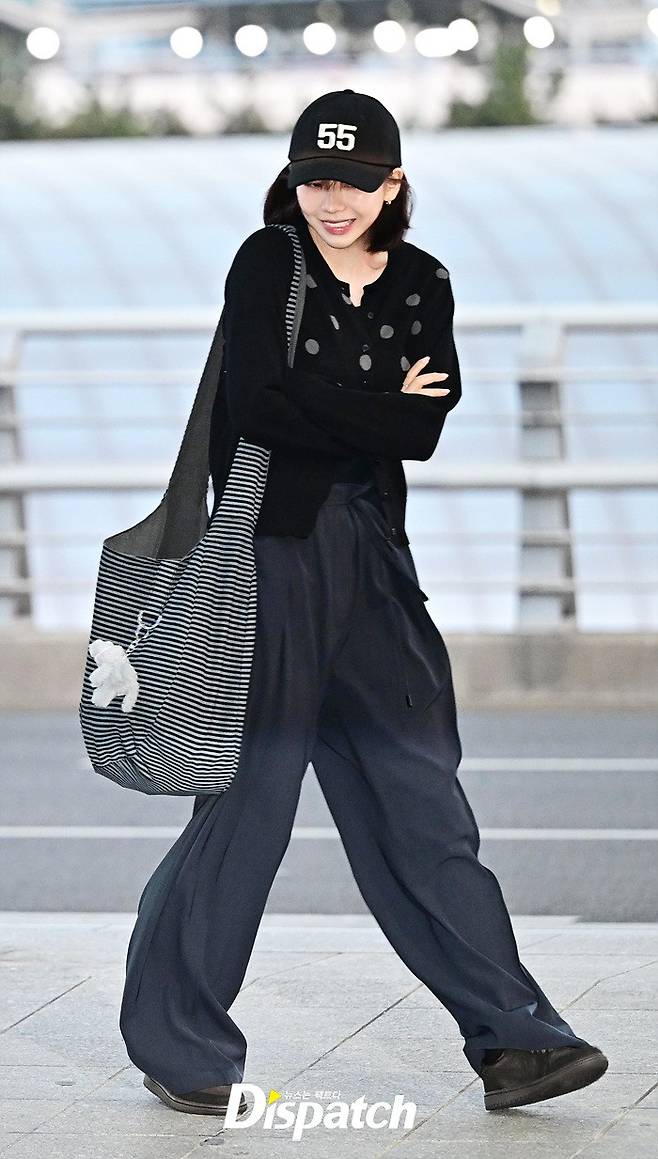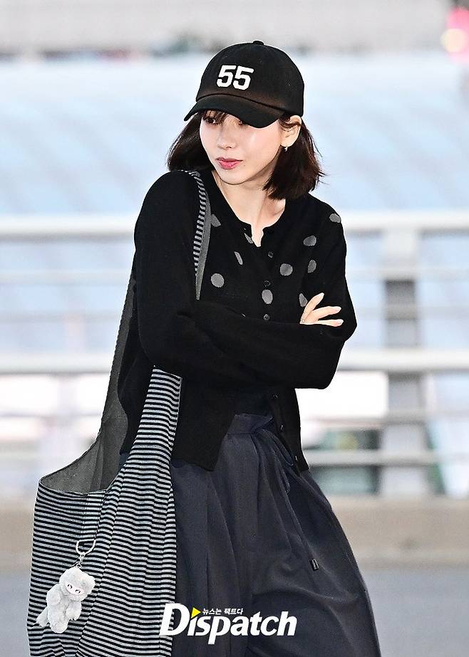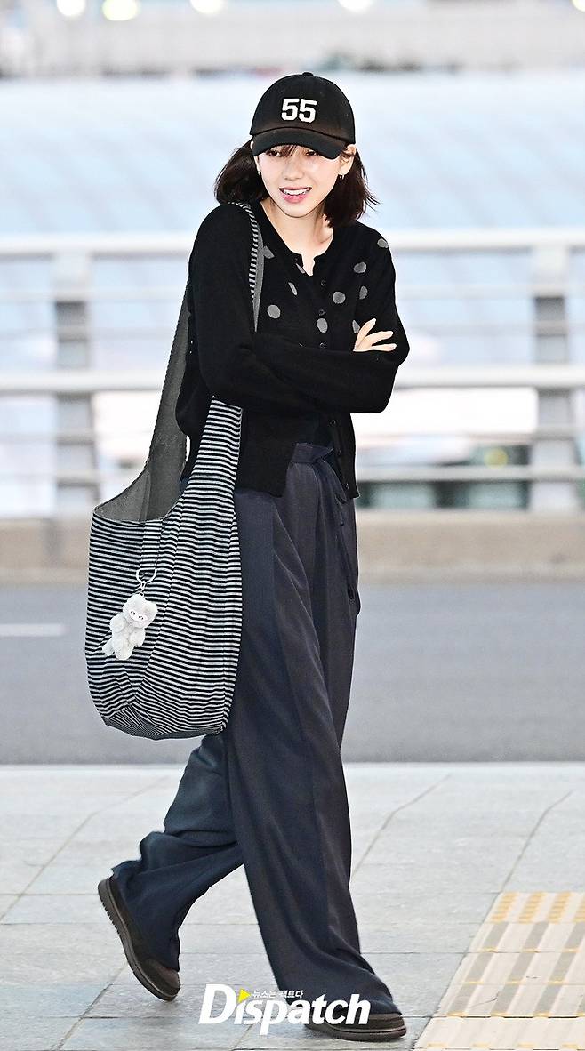 카리나는 볼캡과 가디건, 와이드 팬츠로 캐주얼한 공항패션을 연출했다. 내추럴한 비주얼로 취재진의 시선을 사로 잡았다.