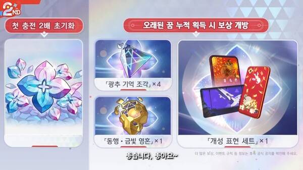 첫 충전 2배가 초기화된다. 3.2버전 기간 동안 일정 수량의 오래된 꿈을 누적 획득하면 캐릭터 코인과 광추 코인, 전용 장식 개성 표현 세트을 얻는다.