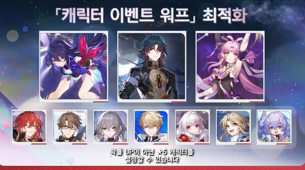 캐릭터 이벤트 워프에서 확률 업 캐릭터가 아닌 5성 캐릭터를 설정할 수 있다. 한정 캐릭터였던 제레와 블레이드, 부현이 포함된다.