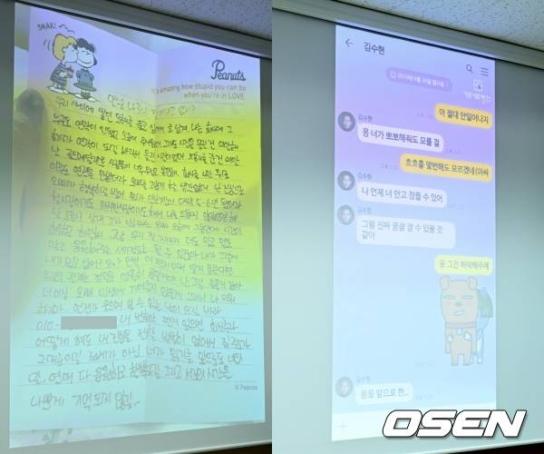 유족 측이 공개한 또 다른 자료는 고 김새론이 내용증명을 받고 지난해 4월 작성한 편지다. 공개된 고인의 자필 편지에서는 “우리가 만난 기간이 대략 5~6년이 됐더라. 첫사랑이기도 마지막 사랑이기도 해서 나를 피하지 않았으면 해”라는 내용이 담겨있어 유족 측이 주장한 2015년 열애-2021년 결별에 힘을 실었다. 변호사는 “내용 증명을 받고 난 뒤 지난해 4월 초에 전달하려고 했는데, 아파트가 아무나 들어갈 수 없는 곳이라 전달하지 못했다”라고 설명했다.