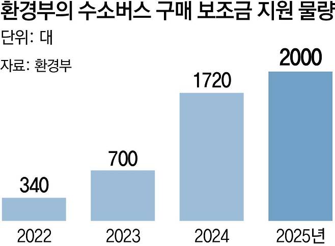 수소전기버스 관련 보조금 규모도 꾸준히 늘고 있다. 환경부에 따르면 수소전기버스 구매 보조금 지원 물량은 2022년 340대부터 2025년 2000대까지 꾸준히 늘었다. 수소전기버스에 배정된 국고보조금도 2024년 4017억 원에서 2025년 4605억 원으로 확대됐다.