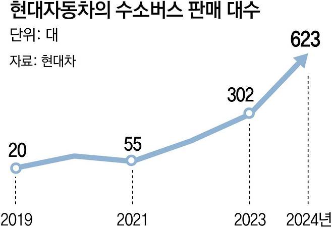 이러한 기조에 따라 현대차의 지난해 수소전기버스 판매 대수는 623대로 전년(302대)의 두 배 이상으로 늘었다. 현대차는 올해 1000대 이상까지 보급 물량을 늘리는 것을 목표로 하고 있다.