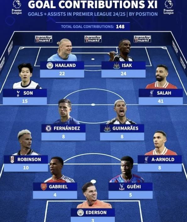 이어 '트란스퍼마르크트'는 지난달 26일 "2024-2025시즌 EPL에서 포지션별 공격 포인트가 가장 많은 베스트 11"라는 주제로 만든 라인업을 공개했다. 손흥민은 당당하게 왼쪽 측면 공격수 자리에 이름을 올렸다.