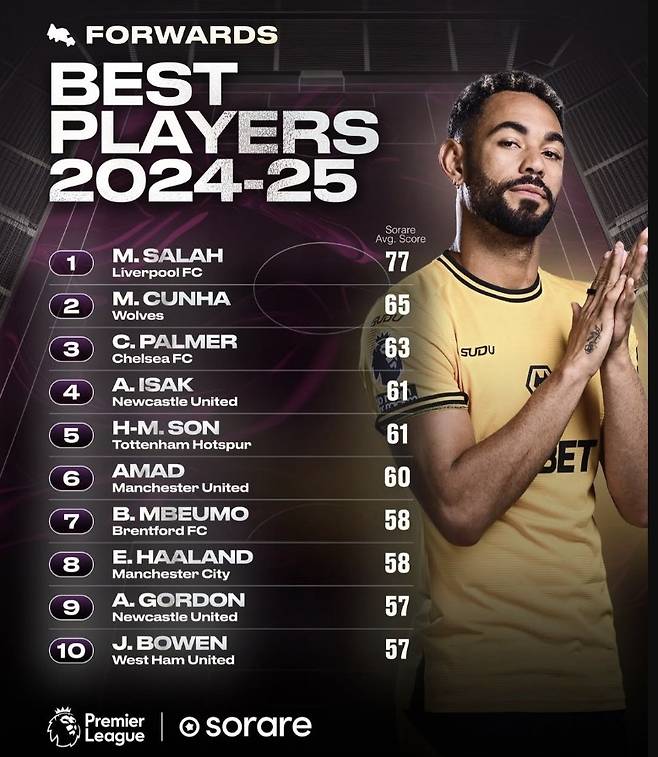 스포츠 게임 기업 '소라레(SORARE)'는 2024-2025시즌 프리미어리그 최고의 공격수 10명을 공개했다. 순수 현실 축구만 기준으로 잡은 것이 아닌 기업 보유한 정보를 더해 평균이 높은 선수대로 순위를 정했다.