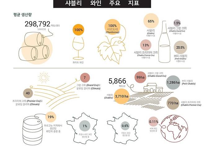 프랑스 부르고뉴 ‘와인 수도’ 디종에서 북서쪽으로 2시간 가까이 달리자 동화나라를 닮은 아주 작고 아름다운 샤블리 마을에 닿습니다. 예쁜 꽃들이 만발한 세렌(Serein)강가 레스토랑에서는 여행자들이 늦은 점심과 와인을 즐깁니다. 그런데 자세히 보니 이들이 마시는 와인은 모두 화이트! 레드 와인은 아예 없습니다. 왜 그럴까요. 샤블리 AOC 와인은 오로지 샤르도네 품종으로 100% 화이트 와인만 생산하기 때문입니다. 화이트 와인에 정말 진심인 곳이네요. BIVB에 따르면 2025년 3월 기준 샤블리 포도밭은 5866ha, 연간 생산량은 29만8792헥토리터(1HL=100ℓ)입니다. 샤블리는 아주 작은 와인산지입니다. 부르고뉴 와인 생산량의 19%, 프랑스 AOC 와인의 1%, 프랑스 와인 전체 생산량의 0.6%, 전세계 와인 생산량의 0.11%에 불과합니다.