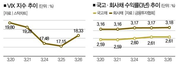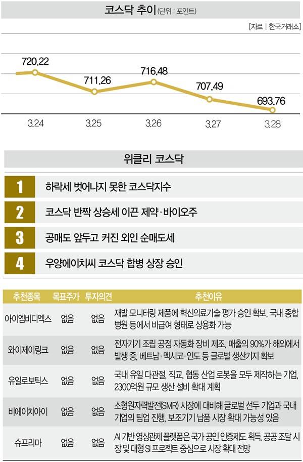 # 상승세를 이어가던 국내 증시가 하락세로 돌아섰다. 3월 마지막주 코스피지수는 불안한 흐름을 이어갔다. 코스닥지수의 하락세는 더 가팔랐다. 3월 18일 745.54포인트를 기록했던 코스닥지수는 25일 710포인트대로 급락했는데, 그 뒤에도 하락세를 면치 못했다.